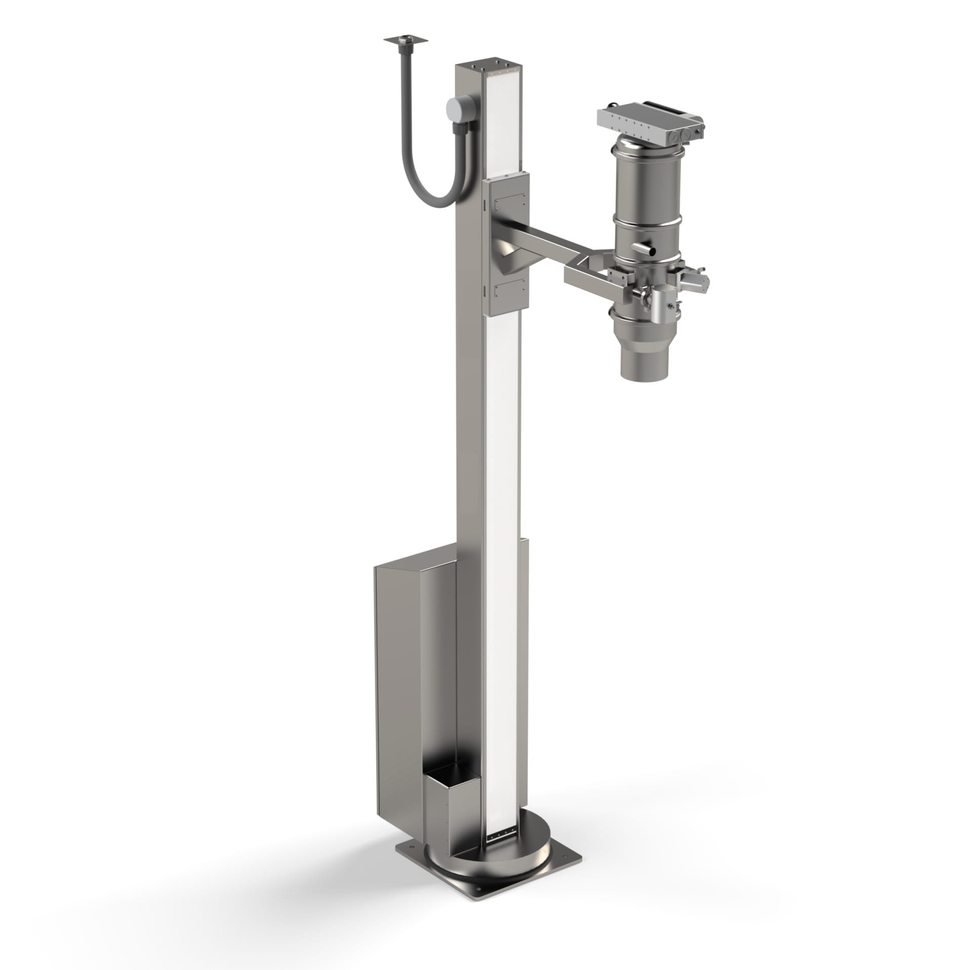 Wersja podnośnika do podnoszenia transportera próżniowego, służącego do załadunku produktów sypkich do kontenerów lub maszyn procesowych. Podnośnik posiada obrotową podstawę.