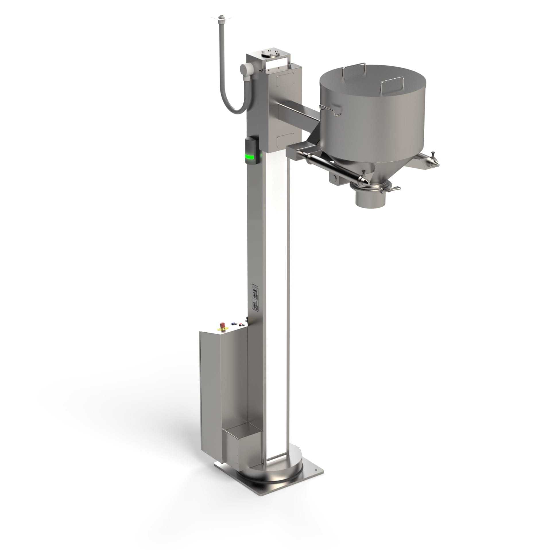Wersja podnośnika do podnoszenia i opróżniania dedykowanych pojemników z tabletkami lub kapsułkami do liczarek lub maszyn blistrujących. Automatyczny obrót podstawy podnośnika.