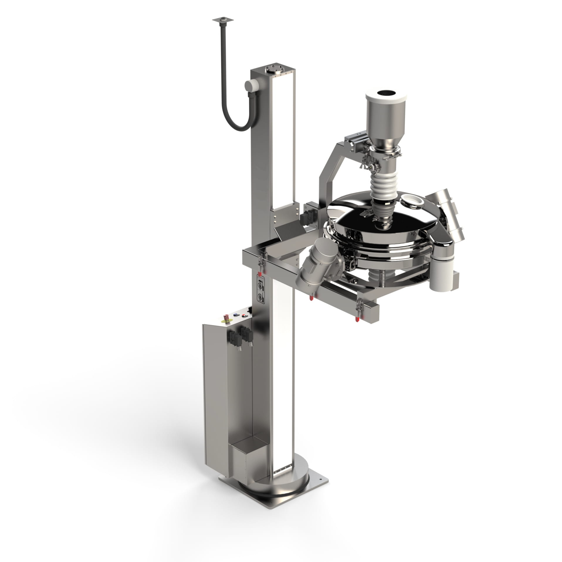 Wersja podnośnika do podnoszenia przesiewaczy do granulatów i proszków nad kontenery produktowe. Automatyczny obrót podstawy podnośnika oraz zintegrowany zawór dozujący celkowy.