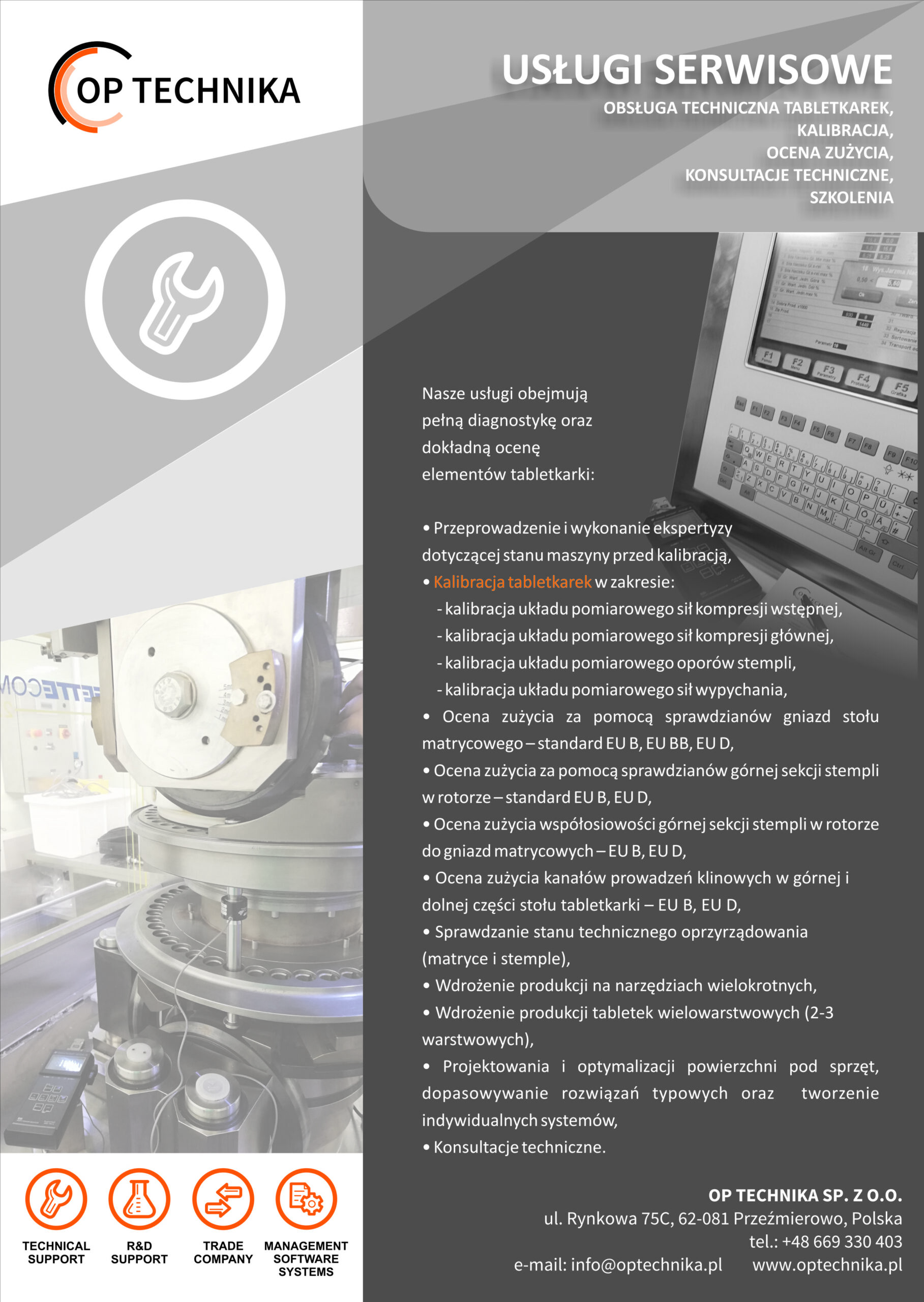 Wychodząc na przeciw oczekiwaniom swoich Klientów firma OP Technika świadczy usługi serwisowe w zakresie sprawdzania sił kompresji wstępnej i kompresji głównej we wszystkich rodzajach tabletkarek.